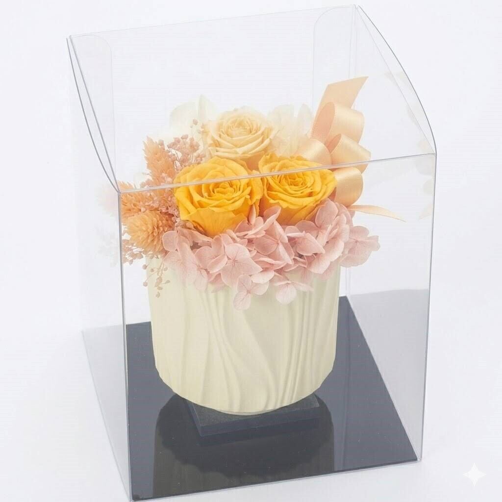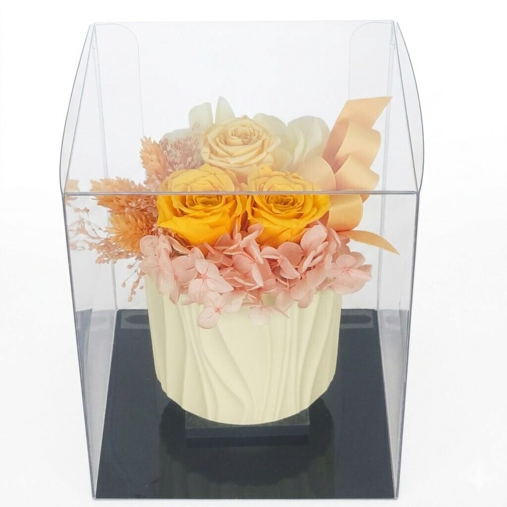 カナリアイエローで明るい印象で、母の日の特別なギフトにぴったりなプリザーブドフラワーアレンジメントです。生花のような美しさを保ちながら、長期間楽しむことができるのが魅力です。お母さまへの感謝の気持ちを込めた贈り物です。
